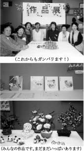 条南地区福祉委員会 昨年11月19日(土)、条南町集会所において、条南地区福祉委員会主催、条南町自治会、条南町長生会(老人クラブ)の協力による「いきいきサロン作品展」が開催されました。この催しは、ひとり暮らしの高齢者の方々がいきいきサロン等で作り上げた作品や、長生会の方々が活動の中で作り上げた作品を展示し、日頃の成果を披露する機会を設けると共に、今までいきいきサロンや長生会の活動に参加されていない方々への広報活動を目的として実施されています。 当日は、作品を出品された人を始めその友人や家族等、数多くの人が見学に訪れ、感嘆した様子で、興味深く作品を眺めておられました。 この作品展の関係者は、「これを契機として交流の場を広げていきたい」と意欲あふれるお言葉でした。