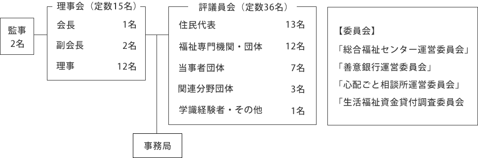 - 評議員の定員は30以上36名以内で、社会福祉に関係のある団体の代表者、又は社会福祉事業に関心を持ち若しくは学識経験のある者で、この法人の趣旨に賛同して協力する者の中から理事会が推薦し、評議員選任・解任委員会によって選任され、会長がこれを委嘱します。