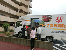 社会福祉協議会では平成29年12月より、地元自治会協力のもと、大阪いずみ市民生活協同組合の移動販売車(コープのお買物便)を誘致しています。買い物を通して様々な人と人とのつながりが広がっています。