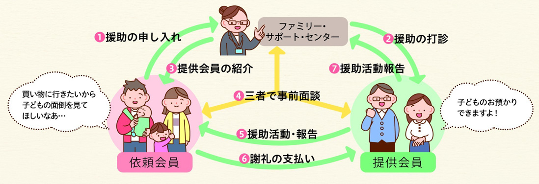 子育ての応援を受けたい人(依頼会員)と子育ての応援を行いたい人(提供会員)が、会員登録して会員同士の相互援助活動を行います。